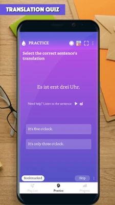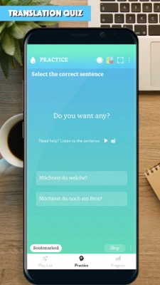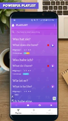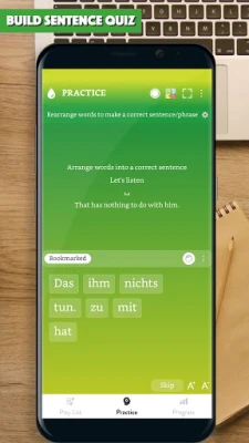 All the app's features are designed to help you learn to make German sentences and improve the main skills: Listening to a sentence, writing (making) a sentence correctly, speaking a sentence/a phrase correctly.