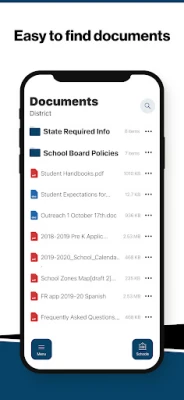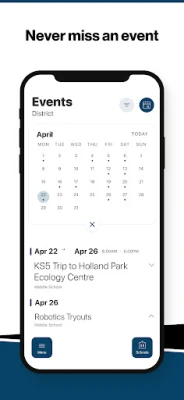 NEVER MISS AN EVENT The event section shows a list of events throughout the district. Users can add an event to their calendar to share the event with friends and family with one tap.